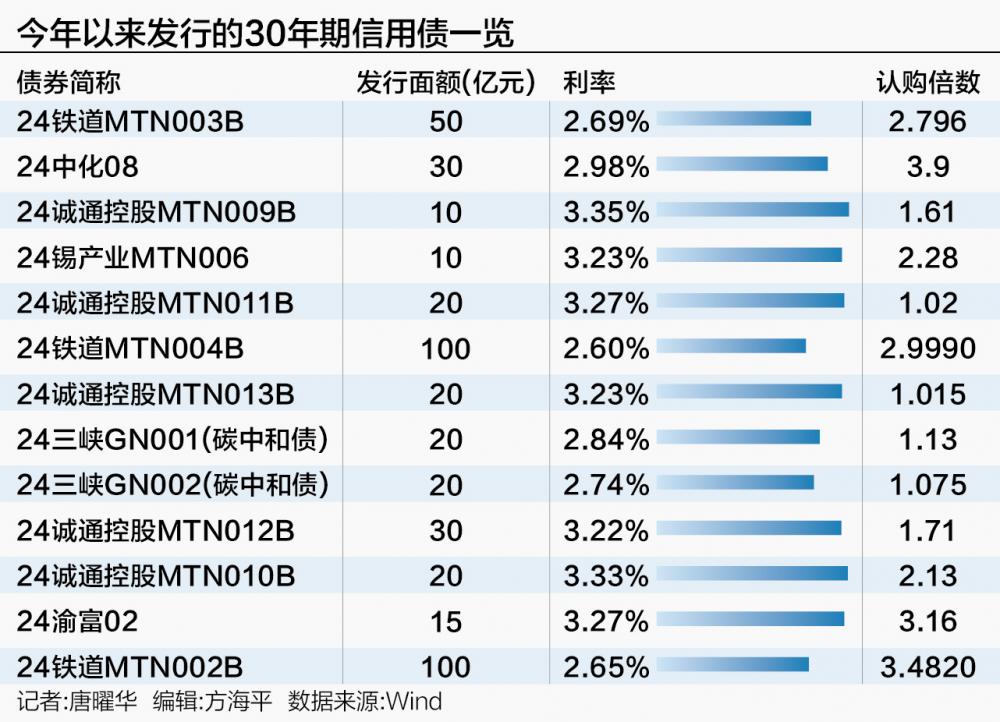 截至6月20日,今年3月以来,已有13只30年期信用债发行,发行主体包括中国国家铁路集团、中国诚通控股集团、长江三峡集团、中国中化股份有限公司等央企国企,以及重庆渝富控股集团、无锡产业发展集团等城投公司。无锡产业发展集团此前6月5日已发行一期30年期中期票据。