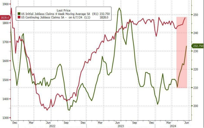 与此同时,美国6月8日当周续请失业救济人数为182.8万人,略超过预期的181万,前值从182万下修至181.3万人。但平滑短期波动的四周移动平均值升至232750,为去年9月份以来的最高水平。