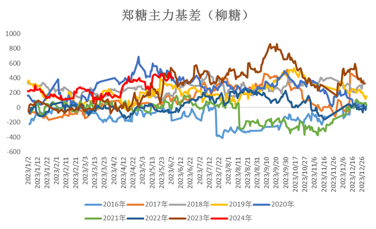 在进口糖尚未放量进口之前,国内预计会维持糖源偏紧状态,因此基差表现较为强势,目前已接近同期最高点。5月食糖进口量仅有2万吨,目前进口糖大幅放量的预期最早也要放在7月份,因此短期内国内缺糖的矛盾难以解决,后续基差若走出期现回归的逻辑,仍会限制盘面下方空间。