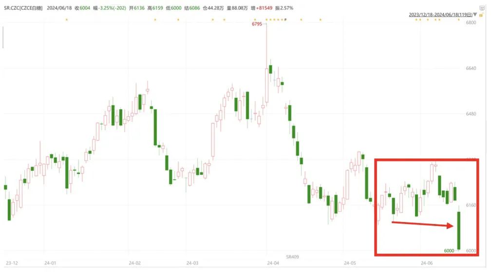 5月中旬盘面触底后转入震荡走势,此前内盘受现货端支撑走势一般强于外盘,但6月以来内盘表现明显弱于外盘,6月18日郑糖下跌破位,收盘6004点,增仓8.15万手,创年内最大单日跌幅3.25%。