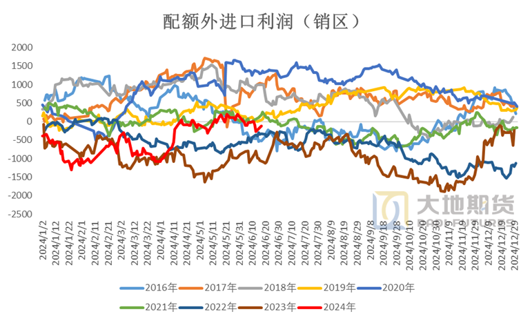 本榨季国内白糖产业的普遍共识是全社会库存处于低位,糖源偏紧,截至目前进口糖加工厂库存仍然较低。但从年度平衡来看,三季度仍需要进口糖来补充国内缺口,内外价差(配额外)此前也处于收缩趋势,4月下旬以来配额外进口利润(销区)在0值附近波动,此区间已高于去年的利润窗口区间,接近前年2022年水平,因此加工糖厂此前也陆续出现买船,但仍有观望心态。近期美原糖重心上移,进口利润有所回落,更好的利润窗口短期内可能不会出现,因此可能会刺激出一部分加工糖的内外套保需求。